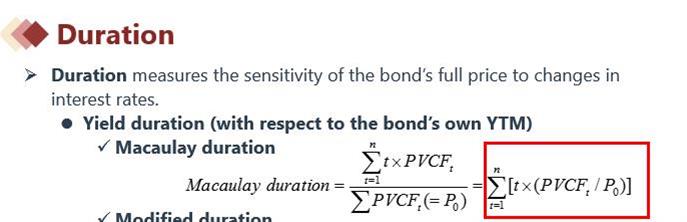 2. 债券息票率越低,后期现金流的现值越大,在债券价格中的占比就越大,时间的加权平均值显然就越高,麦考利久期就越大。所以成反比