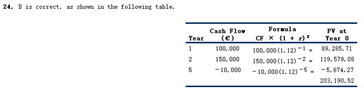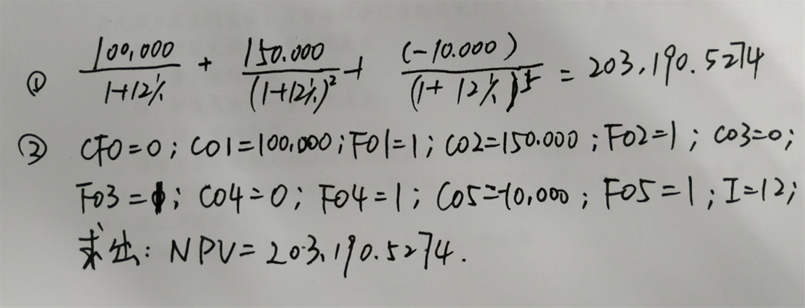 你好,原版书后题第16页第24题,我看了答案,是未来现金流折现求和,即三项想加。为什么不能用金融计算器,算出是C,第三,第四年因为没有现金流,我们就把0现金流输入(C03,C04),也是5年现金流,用CF键,为什么结果不一样,
