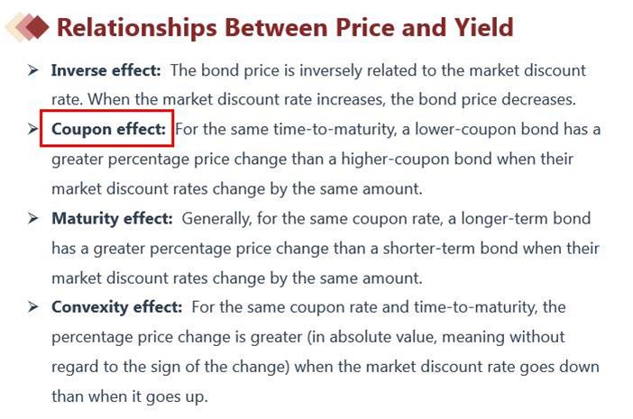 息票效应是在后面的章节Understanding Fixed-Income Risk and Return里面的内容,后面会具体讲解。这里可以先记一下结论:息票率跟债券价格变化大小呈反比