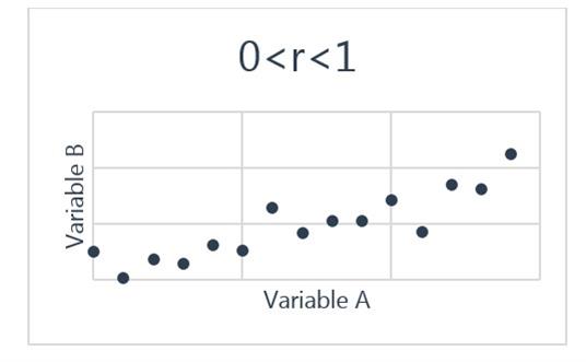 当0<r<1,代表AB之间有不完全的正的线性关系。可以用下列散点图进行描述。平均来看,随着A的上升,B大体上是不断上升的,两个随机变量之间呈现一种正相关的关系,但是所有的散点不能连成一条完整的直线,所以这并不是一种完全的线性关系。
