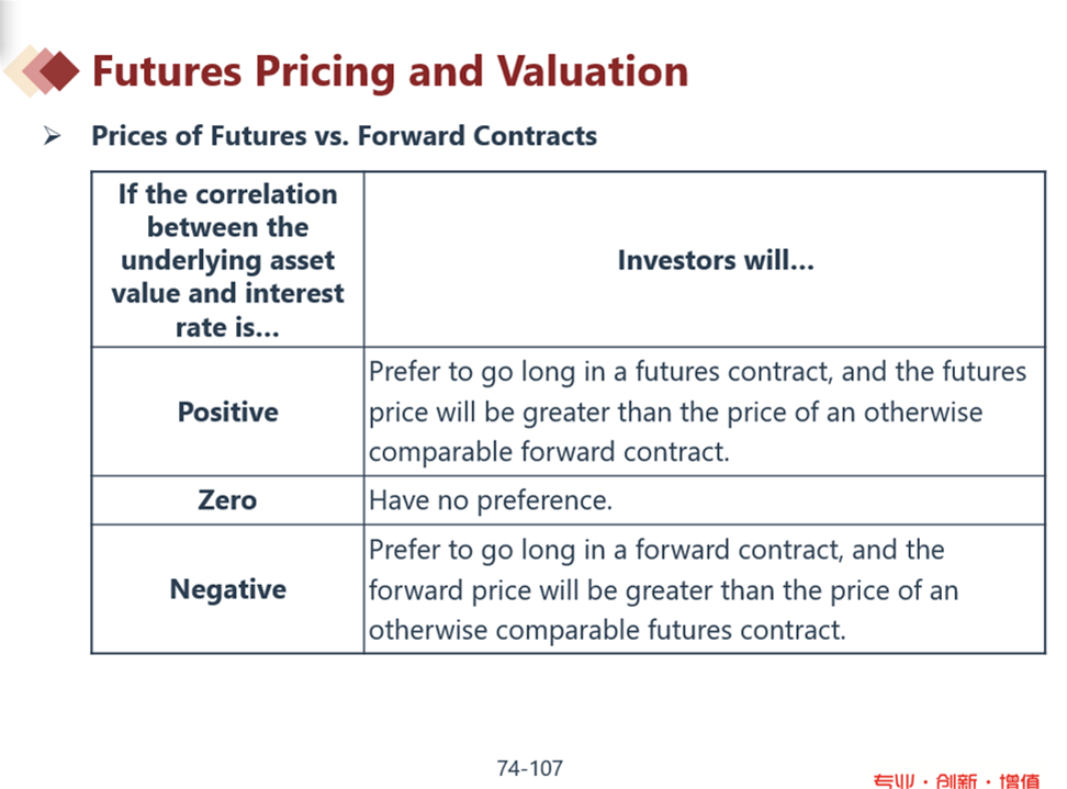 在PPT讲义中可以看出,利率如果和标的资产有相关关系,那么投资者会在远期和期货两种合约中,有偏向的选择,由于偏向性,会导致两种合约的价格不一样。