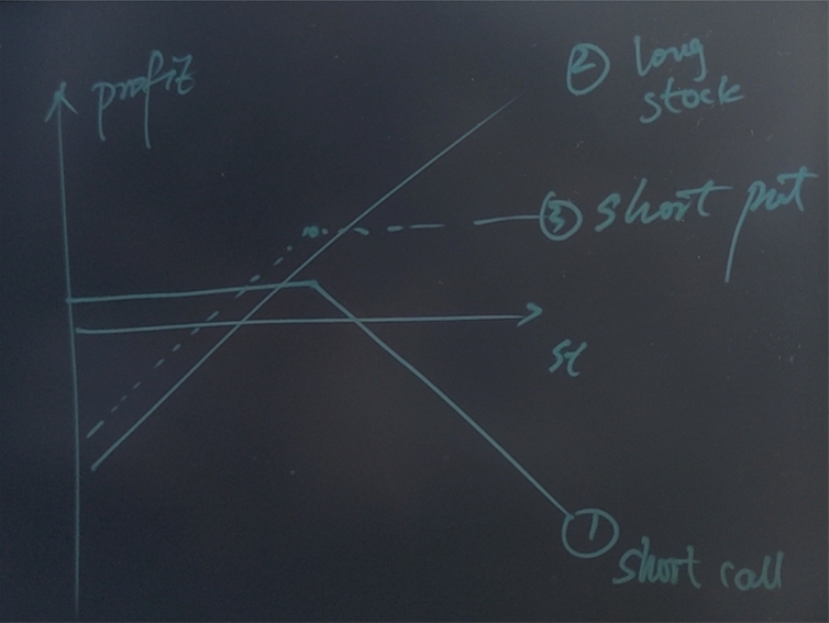 A 可以举例为:short call+ long stock,这样的payoff图形你可以自己画一下,综合来看是short put的一个profit,此时是short看跌,而不是买入的一方