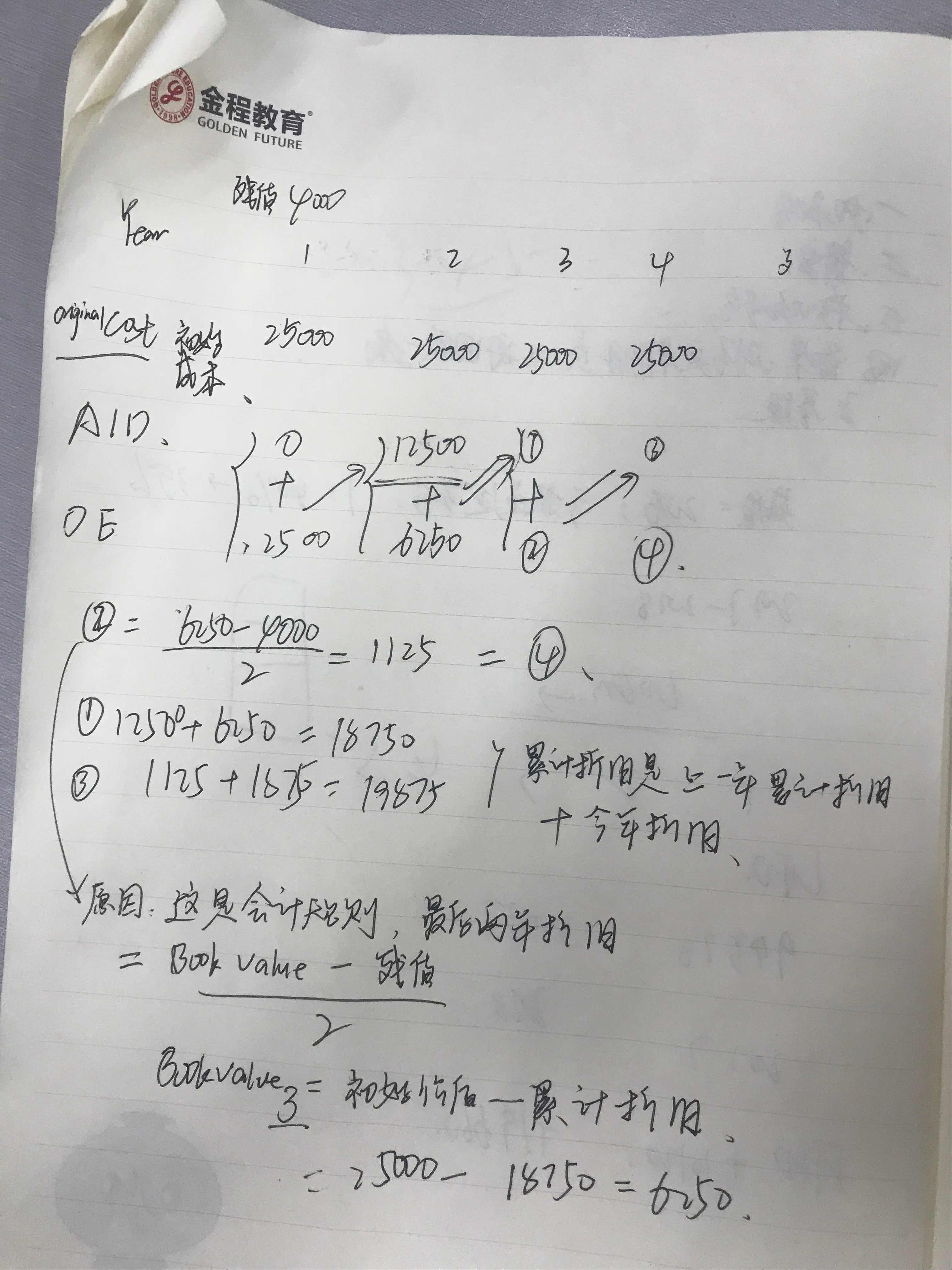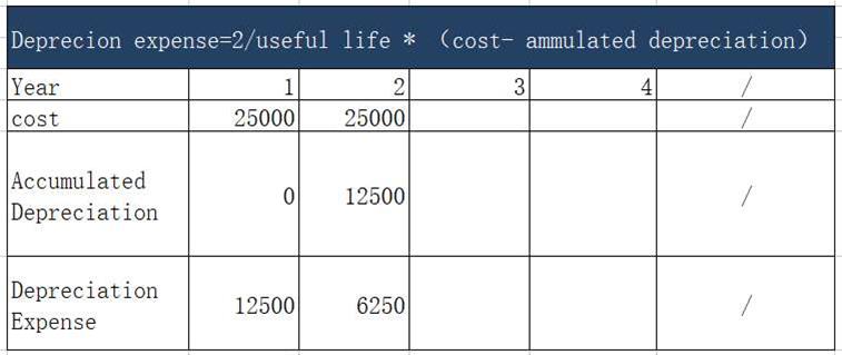 麻烦老师帮忙解一下这道题At the beginning of the year, W corporation purchased a new piece of equipment to be used in its manufacturing operation. The cost of the equipment was $25,000. The equipment is expected to be used for 4 years and then sold for $4,000. Separately calculating the depreciation expense to be reported for the second year, the third year, and the last year using the double-declining-balance method.