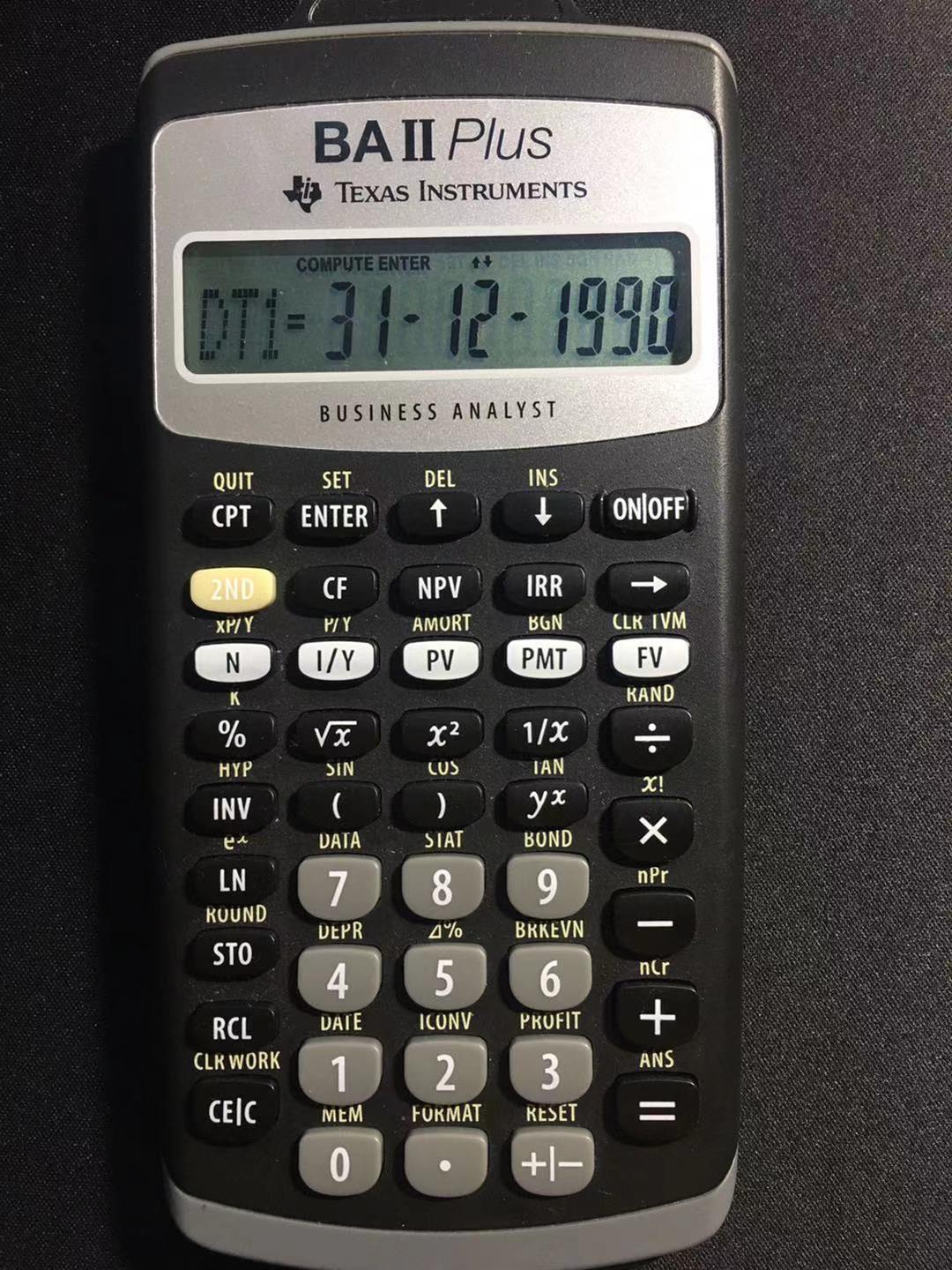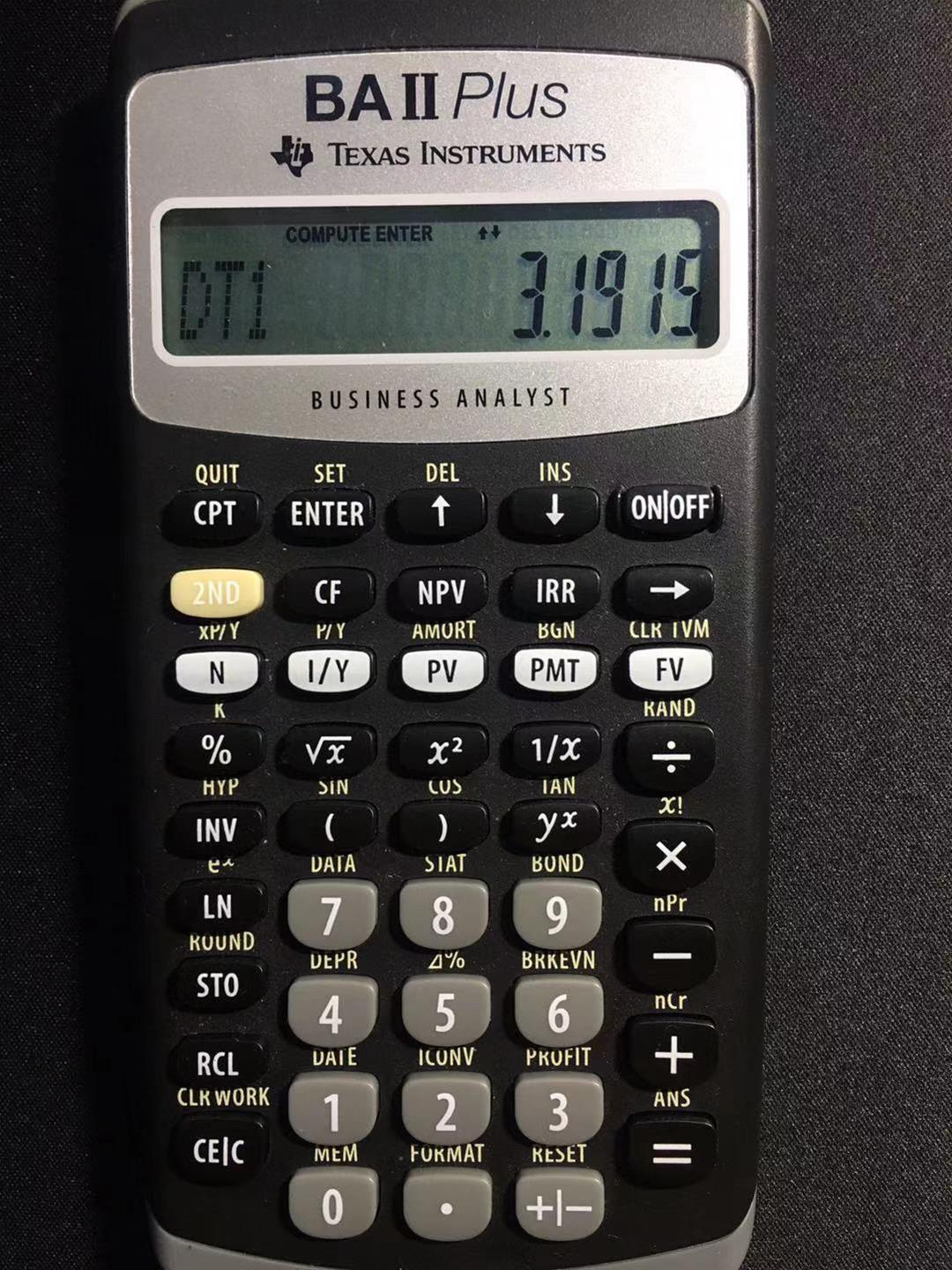 首先按2ND+1这个键,然后输入3.1915,然后按enter,接着按往下的箭头;再输入第二个日期,然后按enter,接着按往下的箭头,出现DBD时按CPT,就能得出两个时间之间的天数