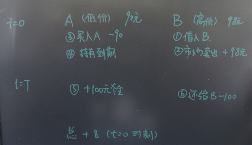 2.现金流完全相同的两种资产的交易价格不同;------例如同一种债券C在AB两个Dealer手中报价不同,在低价A处买入,高价B处卖出,也就是将B处的债券借到手在市场中卖掉,拿到钱,给A,买A处的低价债券,到期时,从A得到par value,将par value还给B处。这种情况(在低价A处买入,高价B处卖出)转差价。