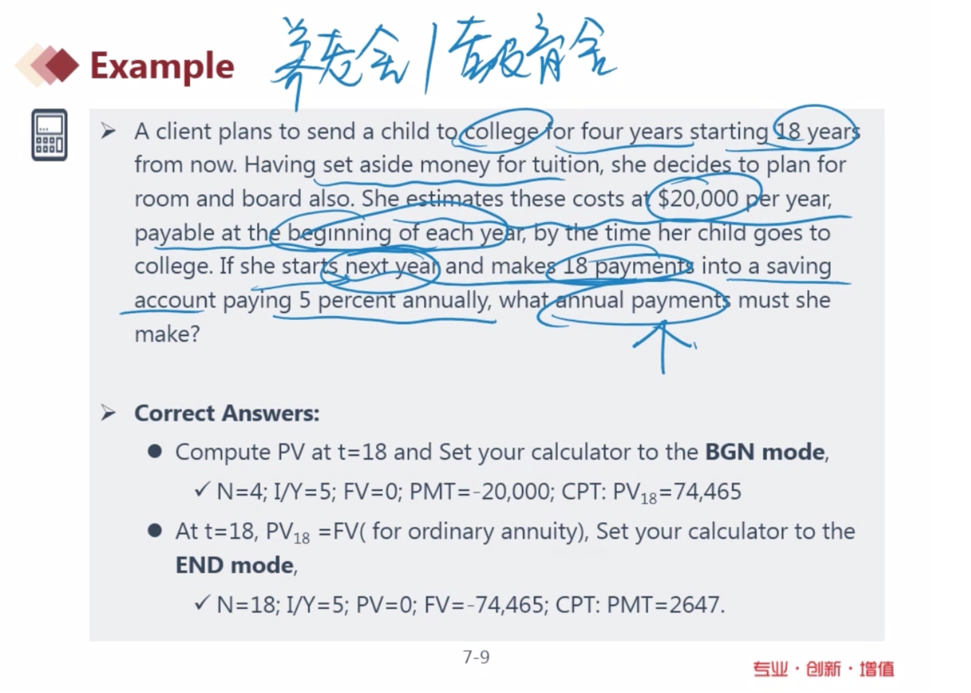这里有个问题想不明白。我觉得这里第一周期的FV应该是8万块而不是74,465。虽然从Time value money的角度考虑每年2万,贴现第二周期的PV是74,465。从实际角度考虑,我不可能在账户里只存74,465,因为这个金额根本分不够每年2万的学费。所以我真正需要的是8万块钱,才能保证未来4年能付得起每年2万的学费,7万4不够分。那么也就是说在Year 18的时候我需要的是8万,而不是7万4。