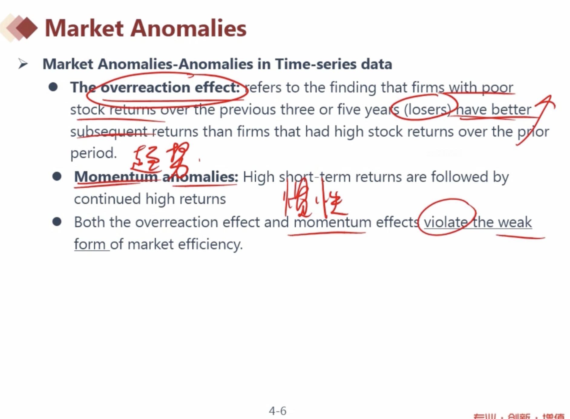 2. ppt这个第四页上说两种情况属于市场异动, 违背了弱势有效市场假说, 而ppt第二页说市场异动不能推翻市场有效假说, 这不是前后矛盾吗?