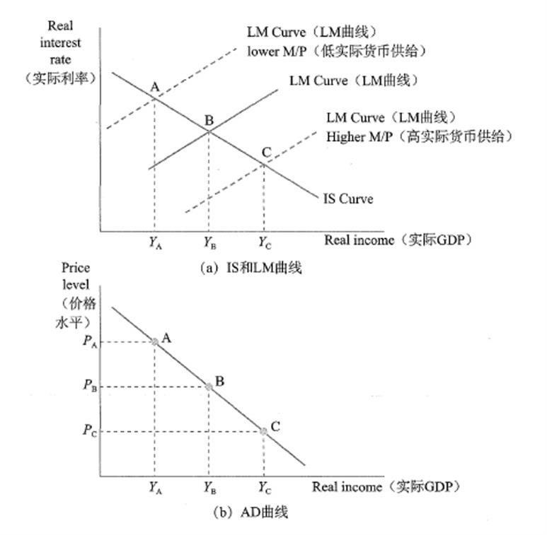 AD曲线,当同时满足商品市场和货币市场均衡时,则得到了总需求曲线:当把IS与LM曲线结合起来,它们之间的交点就表示了同时满足收入—支出均衡(IS曲线上的点)与实际货币供给—实际利率均衡(LM曲线上的点)时,物价水平与收入之间的关系。