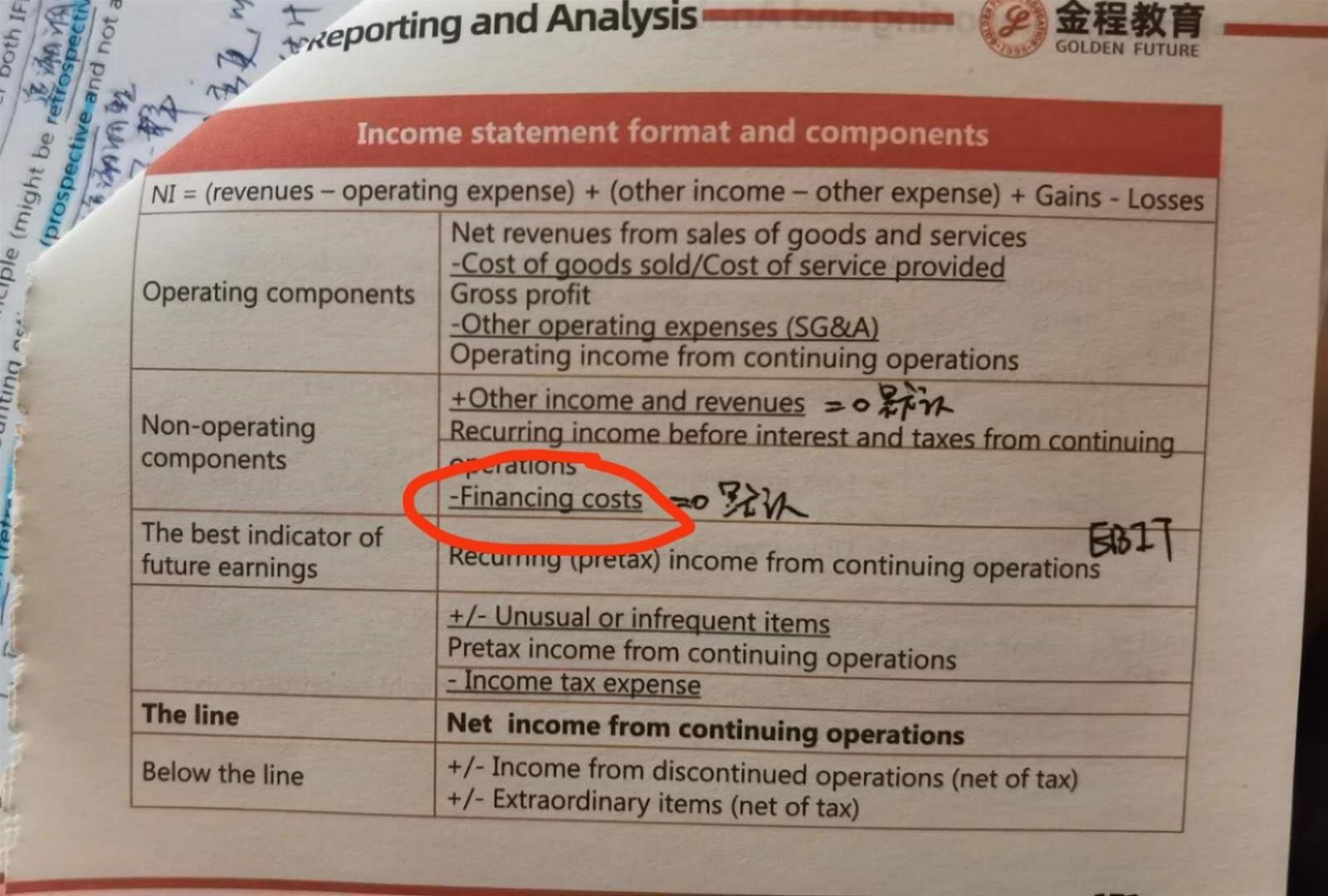 在利润表的format视频中,老师列出了息税前利息被一次减去后剩下的是净利润,(第一张我手写的图),在知识框架表格中,利息是在哪里被减去的?为啥找不到呢?(第二张图)