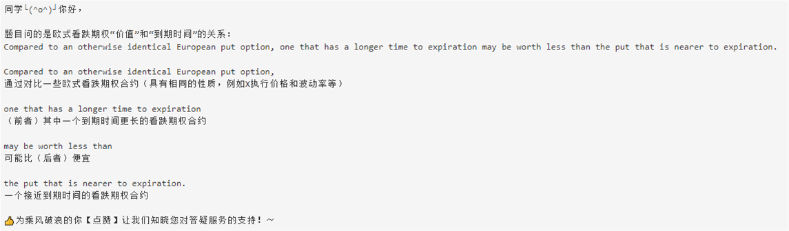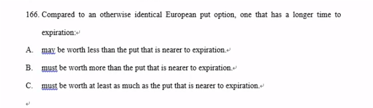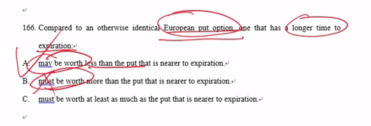 166题,Compared to an otherwise identical European put option, one that has a longer time to expiration may be worth less than the put that is nearer to expiration. 麻烦老师从英语阅读理解角度讲解下这个句子,尤其是请十分具体和详细地说一下它是拿一个什么东西和一个什么东西在作比较,谢谢!