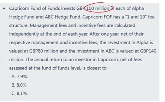 老师,这个题为什么收取的Incentive fee是用20million来算呢而不是40,两个基金不应该分开单独计算吗