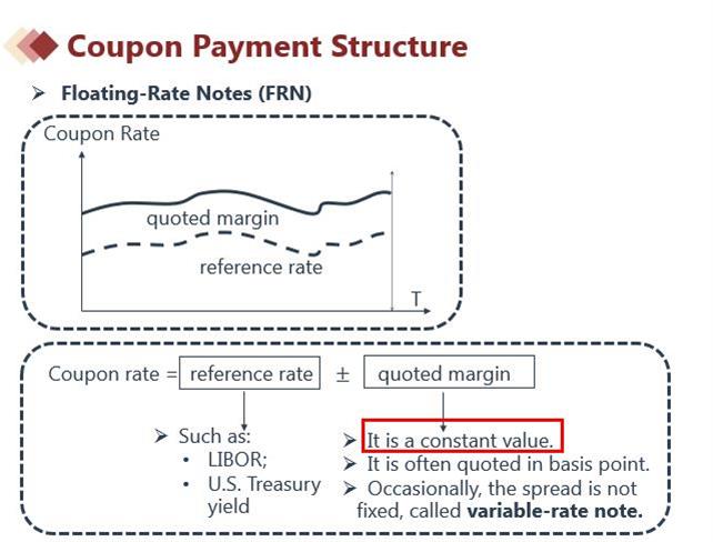 因为这是针对浮动利率债券,浮动利率债券的coupon rate规定了Coupon rate = reference rate + quoted margin,见下图,constant value的意思就是固定的,所以对于浮动利率债券的coupon rate只跟libor的变动而变动。