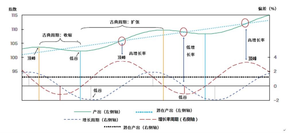 growth cycle,增长周期,指的是经济活动围绕长期潜在或趋势增长水平的波动,即实际经济活动在多大程度上低于或高于经济活动的趋势增长。反映在上图中,即深蓝色虚线所描述的实际产出与潜在产出之间的差额。当前,经济学家们将增长周期分解为两个部分,一部分由长期趋势驱动,另一部分则反映短期波动。同古典周期相比,顶峰通常会更早到达,低谷则更晚到达;另外,在增长周期中,经济处于趋势增长上方和下方阶段的时间长度是相似的。