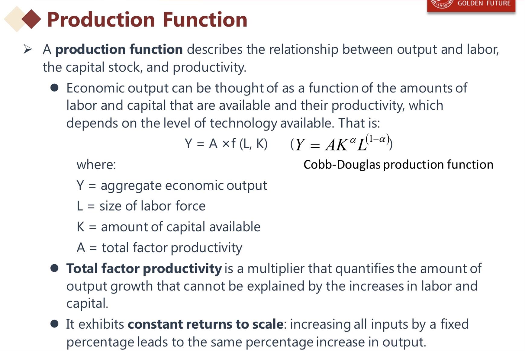 讲义中在经济增长模型部分所讲的柯布道格拉斯生产函数,就是这里提及的 neoclassical growth model 新古典主义增长模型。在模型中,全要素生产率的增长反映了以下方面的增长: 全要素生产率(TFP)是一个主要反映技术的规模因子。TFP的增加意味着任何水平的要素投入的产出都会增加。故选项B是正确的~