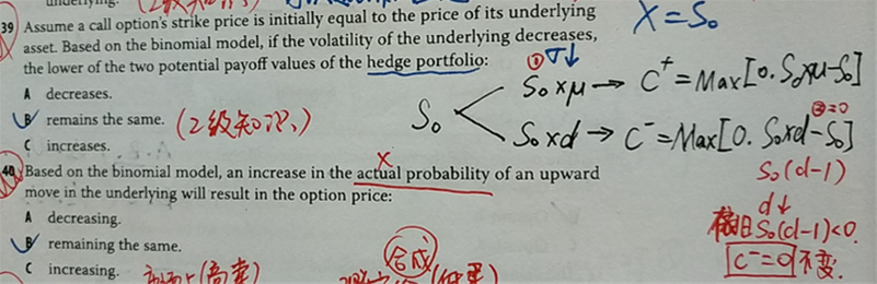 第一个问题在一级中考查有点难,主要是涉及了二级衍生的知识。这个考点是在之前的考纲中的,现在2020年考纲是将这部分内容移至二级,但是课后题没有删去,还是保留着的,了解即可,因为二级的重点是学习这个内容,BSM model对期权定价。