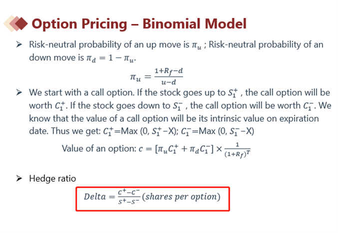 二叉树中,在第一个时间点,有S1+和S1-,有C1+和C1-,这两组数值的差值,此时定义:delta=[C1+ - C1-]/[S1+ - S1-],将公式变化:delta x [S1+ - S1-]=[C1+ - C1-],当 [S1+ - S1-]=1单位,[C1+ - C1-]等于delta单位。