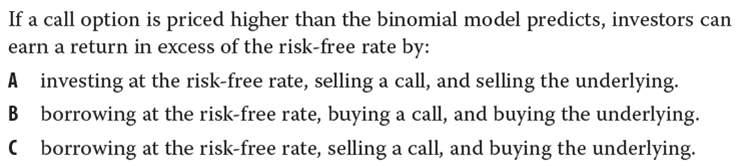 题目call option is priced higher,对应C中的“selling a call”,高卖;但是要卖什么呢,卖的是call,也就是short call,在将来有义务卖标的资产,现在手里没有,那需要合成,于是以risk-free rate借钱,对应C中borrowing,然后买资产,对应C中的buying the underlying,在合约到期的时候卖出。