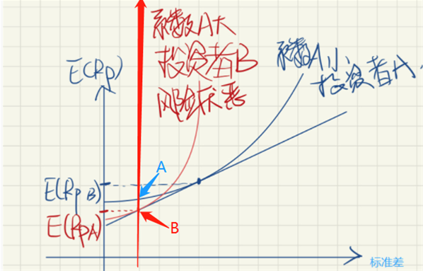 当风险一致的情况下,标准差一样的情况下,红色垂直箭头表示。