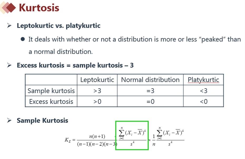 这一点,可以通过下图峰度的公式来看出:在尾部,极端值与均值的偏差越大,计算出的K值也就越大