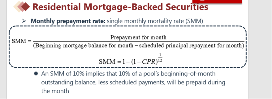 同学你好,首先说明,公式和课件是一样的。原理是这样的,每个月第提前还款率是smm,每个月剩余就是1-smm那12个月后就剩余(1-smm)的12次方,年提前还款就相当于1-上述的值,那反推smm就是前面那个公式了。
