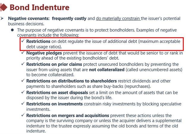 老师,想再具体确认一下,如果选项中说“require to maintain the debt ratio”是属于negative covenant吗?强化课上是这么说的,但我查看了课件和自己做的笔记,重大限制条款里都没有这一项,比较类似的就是限制额外发债了。