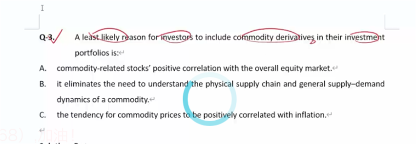 这里的第三题我不是太明白,a和c都是表示投资大宗商品的好处。可是positive.correlation不是代表分散化效果差吗,这样不是加大风险吗,怎么会起到抗通胀的作用啊