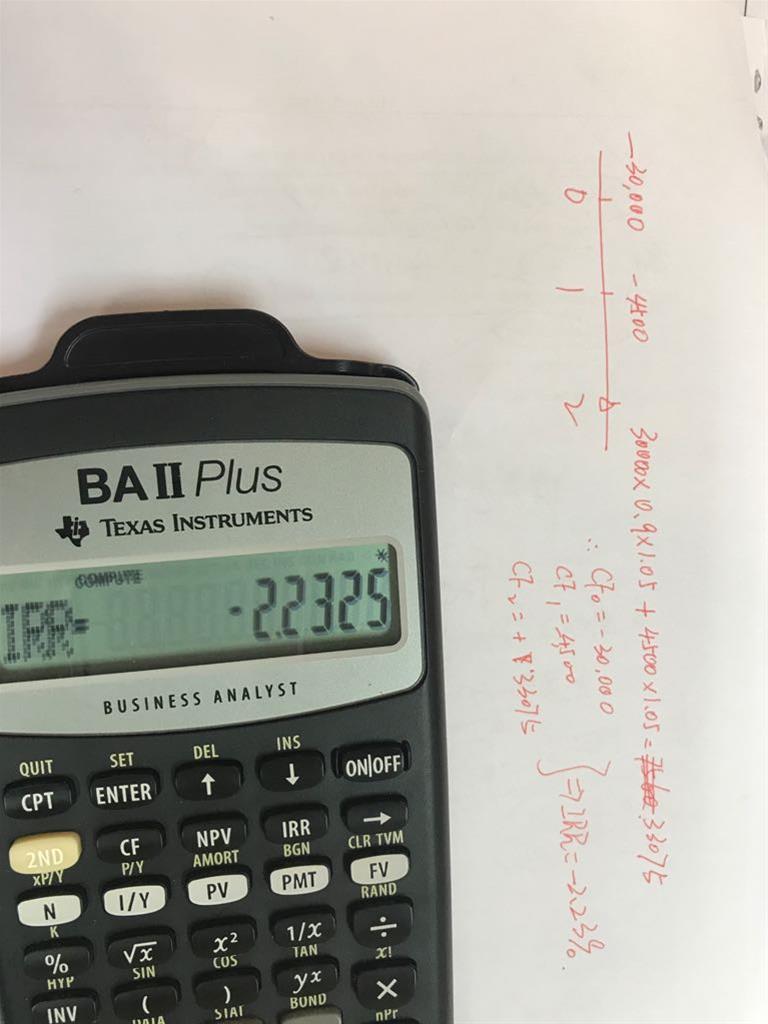 老师 为什么第一年投资之后的return:30000*(-10%)=-3000没有计算在第一年末的现金流流出呢?也就是说题目中CF2=-4500+3000=-1500???
