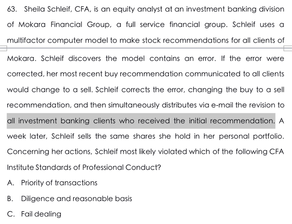 谢谢老师。对于这一题的fair dealing我还是暂时没理解到。如下图这一题,同样是all clients后紧跟定从描述一类客户,该题就属于违反fair dealing了。😂所以,考试的时候,遇到这类情况,什么时候才属于违反fair dealing呢?