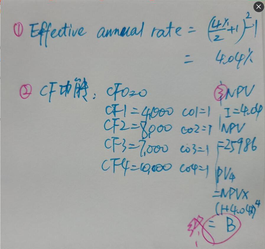 A saver deposits the following amounts in an account paying a stated annual rate of 4%, compounded semiannually: Year End of Year Deposits ($) 1 4,000 2 8,000 3 7,000 4 10,000 At the end of Year 4, the value of the account is closest to: A.$30,432 B.$30,447 C.$31,677 这道题按计算器怎么按啊?