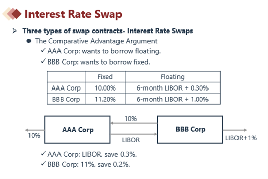 B和AAA商量一下,于是BBB以Libor+1%借浮动,以“Libor+1.0%”这样的一个利率水平借钱,AAA以10%借固定,以10%这样的一个利率水平借钱。他们之间互换10%和Libor,你可以从图上中间两个框框看出。