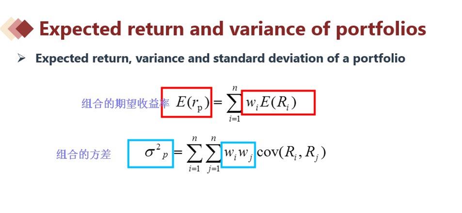组合的期望收益率公式,见下图的红色框,它等于组合中各个资产的收益率×各自的权重然后求和。