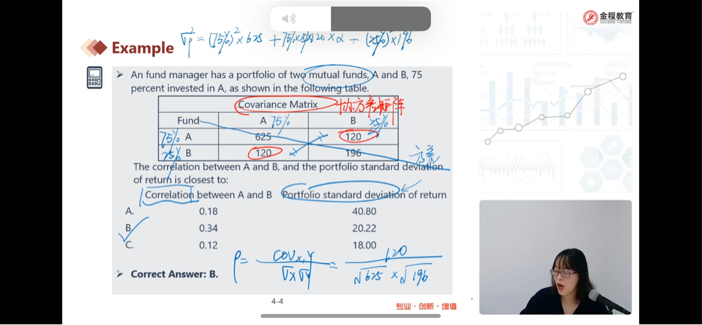 4)方差公式中,带入的就是资产间的协方差,也就是协方差矩阵中的数值,是不需要2次方的。在协方差矩阵的对角线上,也就是表格中的625,196,这两个数据表示的两个资产一样都是资产A和资产B,那么此时的资产A与资产A之间的协方差625就等于资产A的方差625,同样,资产B与资产B之间的协方差196就等于资产B的方差196。