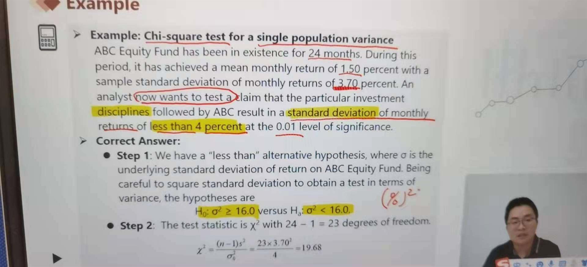 根据题意,是standard deviation 标准差σ0=4%。而单个总体的方差 variance 检验时,原假设和备择假设都是设的是方差是否等于(或大于等于、小于等于)某个常数σ0^2