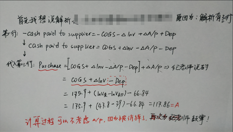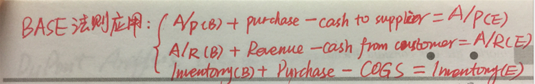 王敏同学你好,请参考下图,用老师给的公式可以算出;而你想用的公式中,没有给cash paid to supplier,算不出purchase