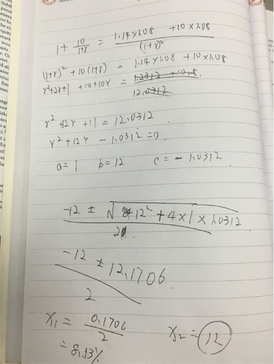 同学你好,第十一题,这也是一道求MWRR和TWRR的题目,先把各个时间点的收益都算出来,为了简化把million去掉,第一年投入10,收益1.4,第二年投入100,收益8,还是用跟上一题一样的方式,把等式左右两边相等,解一元多次方程,把这个r求出来就可以了,或者用计算器的CF键。再把TWRR算一下,收益率相乘开根,两个一比较就可以了。我给你列一下这个方程的解法,一元二次就可能会有两个值,算出来等于12那个肯定不可能,收益率不会那么高的,所以就是0.0853。建议你再看看这部分的视频,解不了一元多次方程可以百度一下。并且活用计算器