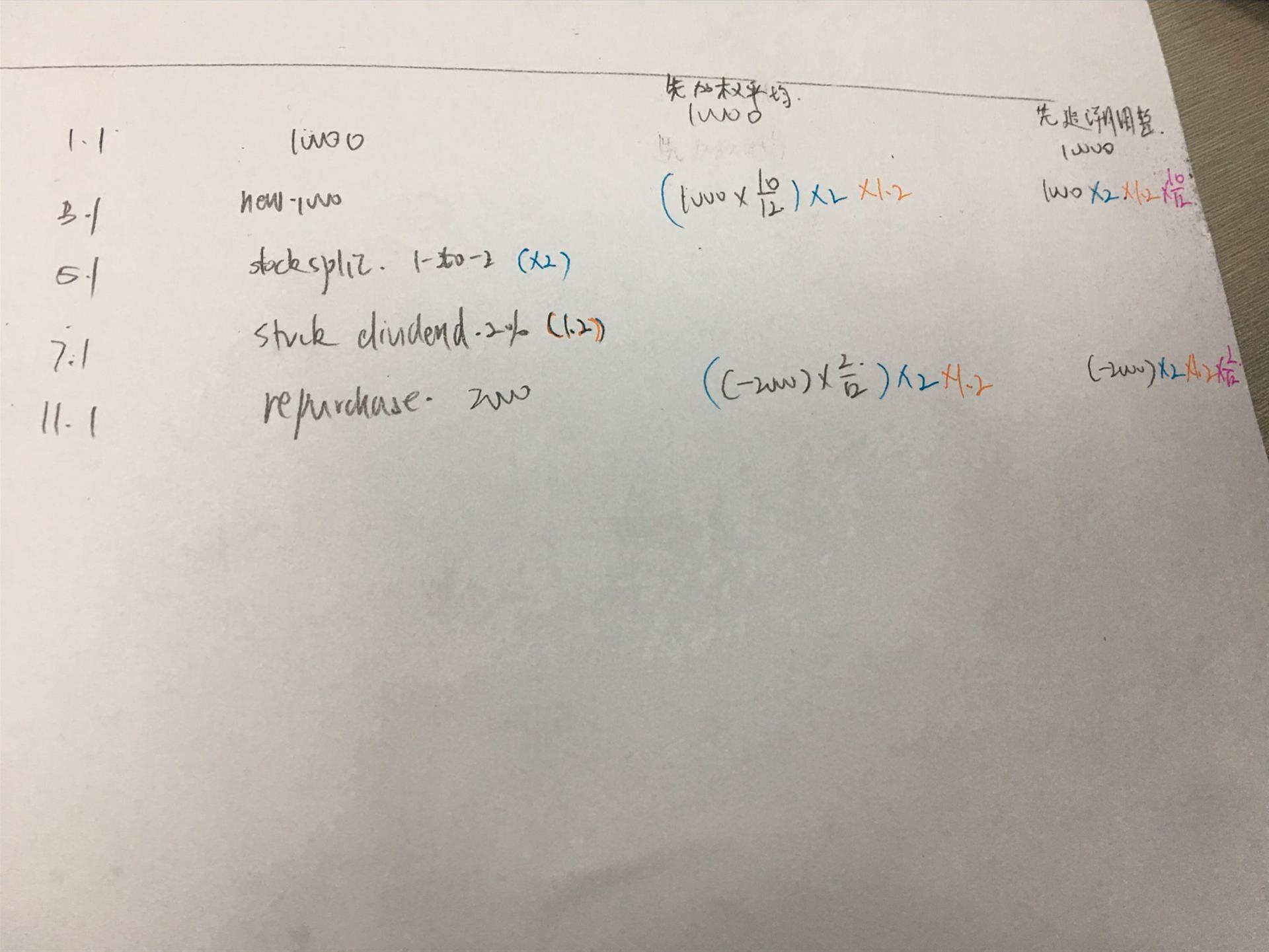 老师,麻烦对比一下这两道题目。后面是纪老师当时讲课做的笔记。我觉得很有疑问。 题1.从图二的答案来看,疑问1.这道题2014.6.1新股发行时间是七个月没错,但是8.1号有1股拆2股,拆出的股数120000是否要算入去加权?疑问2.答案为什么加权120000*7/12以后再去乘以2,而不是120000*7/12+120000.或者不是纪老师讲的240000*7/12? 题2.是纪老师讲课的例题笔记,按照纪老师讲的,对于3.1号新发股票100股,5.1号分拆之后变成200股,11.1发放10%时变成220股,考虑时间加权的股数却是220*10/12。 所以对比起来我不知道标准到底是怎样计算的。