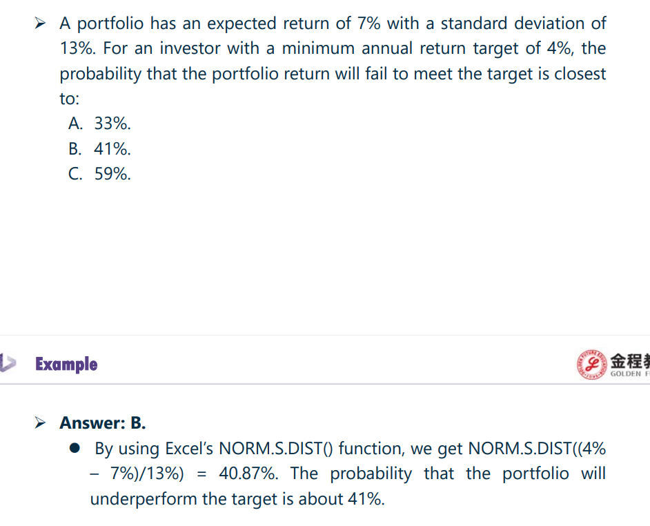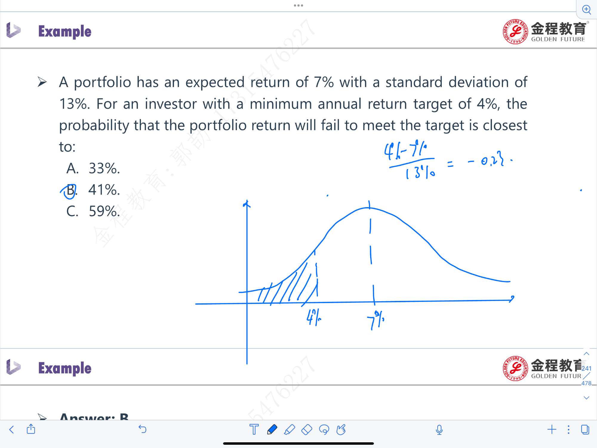 我们认为收益率服从正态分布,题目中已知均值为7%,目标收益率4%在7%的左边,4%-7%=-3%,负号表示左边,3%表示4%和7%的距离(分子)