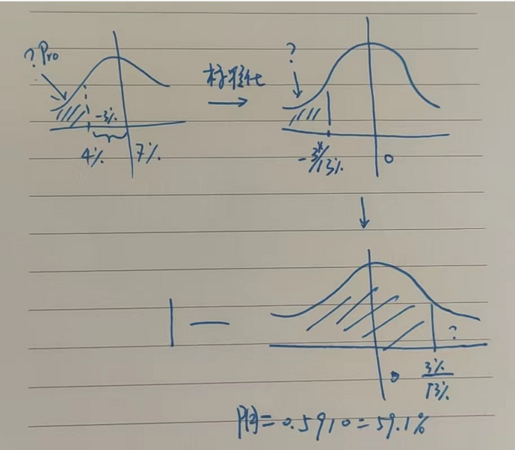 相当于z标准正态分布中,标准化“-3%/13%=-0.2308”这个点左边的面积,可表示为F(-0.2308)