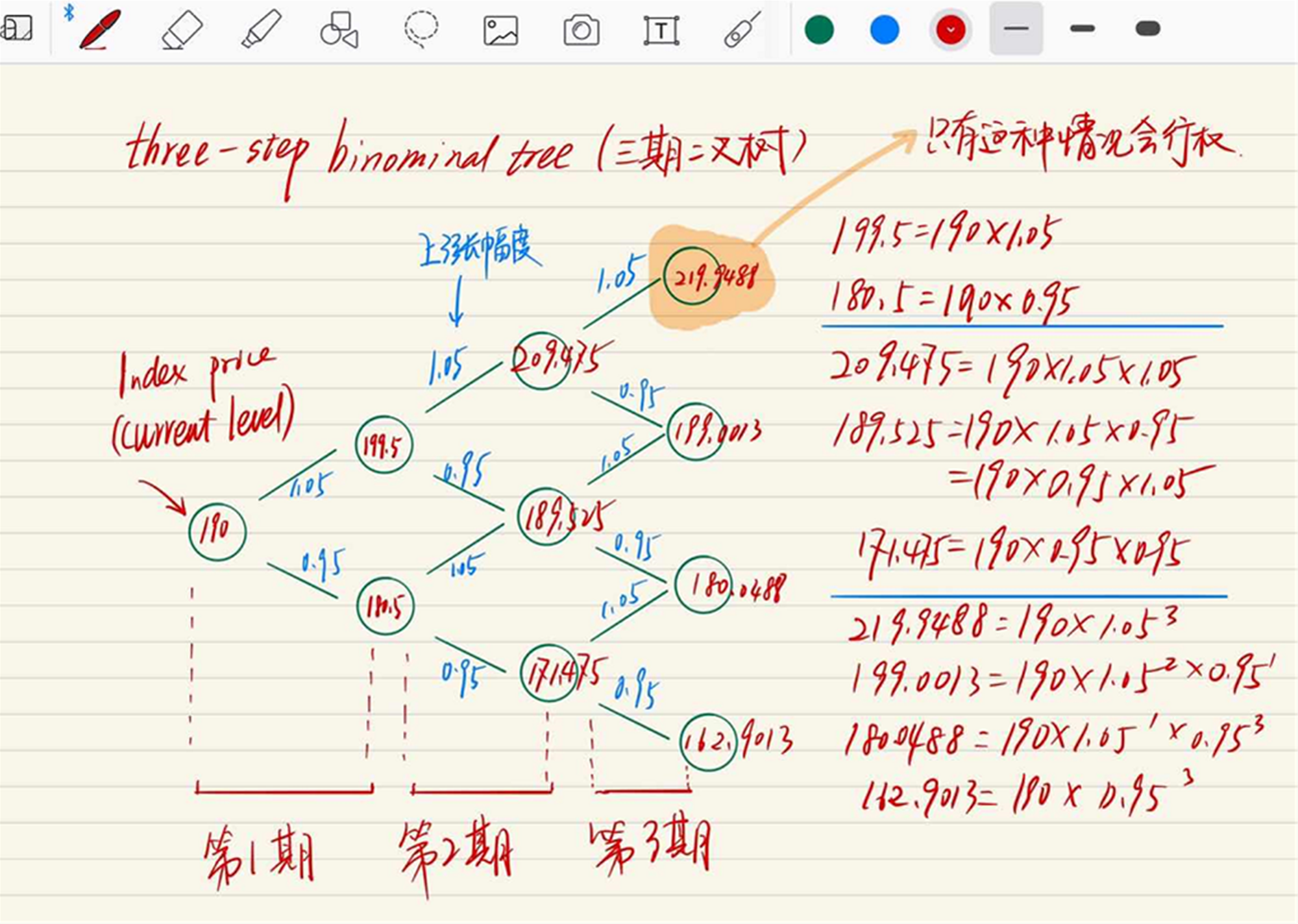 最右边的四个圆圈是terminal node,是期末时间点(一共有4个)可能发生的结果,其中标黄的圈圈数额大于200(执行价格),此时欧式期权的payoff是正数
