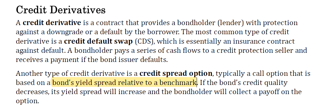 【回复】在你的例子中,A和B之间的关系是A买了B公司的credit spread option,标的资产是“credit risk”或者是截图中“bond´s yield spread-benchmark”,credit spread option和A自己发行的债券没有关系。