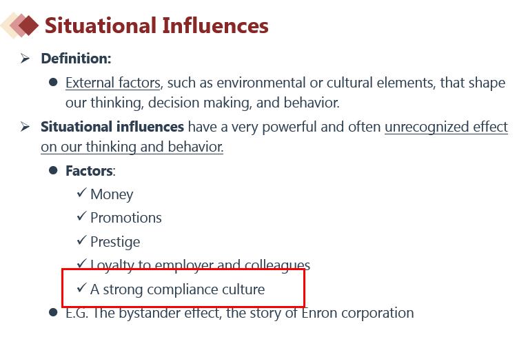 这里的意思是说不要把合规程序和道德规范混为一谈,合规程序虽然也包括了一些道德规范,但是并不是全部的,因为它更侧重于一些工作上的流程。如果只有合规程序依然可能会出现不道德的行为。