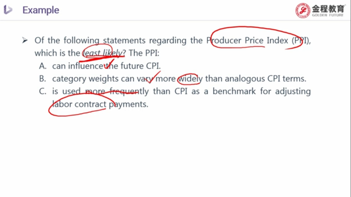 而题目问的是:下列有关生产者价格指数的陈述中,哪一个是最不可能的?因此,选项C是最不可能的。