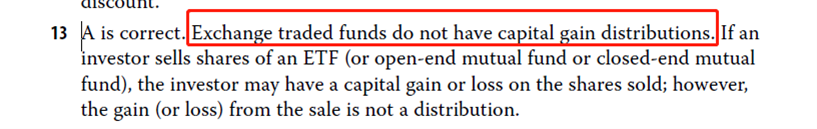 Which of the following financial products is least likely to have a capital gain distribution?A. Exchangetradedfunds.B. Open-end mutual funds. C. Closed-endmutualfunds.为什么选A,什么是capital gain distribution