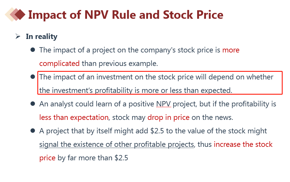 在impact ofNPVrule andstack price里就讲了一个股价上涨的例题,而且还说这种情况下(即一个项目赚钱),投资者预期其他项目也赚钱,因此会买的更多,导致股价上涨得更多。跟这个题目不是矛盾吗?