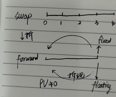 当swap拆成一系列远期合约,这些远期合约在期初时间点的价值有正有负,我们称这些远期合约为off market forward(假设swap是一个一年期12个月,每个季度末,换浮动和固定利率的swap;将其中一个时间点的浮动和固定利率拆出来,如截图,因为浮动和固定利率对应的现金流不相等,所以折现到0时刻的现值不为零,此时远期合约的价值不为零)。