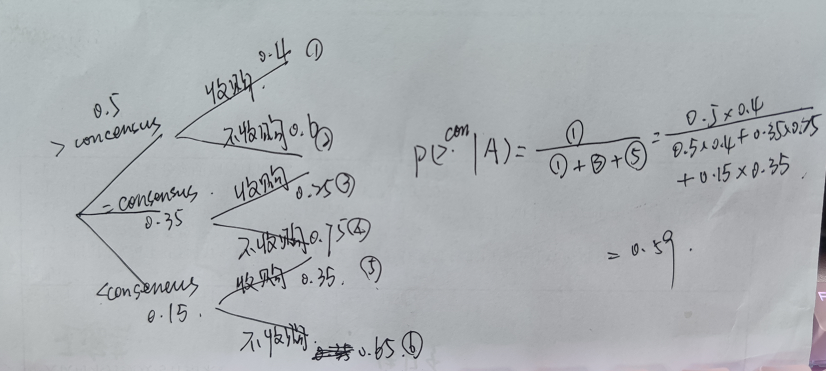 题目问的是当第二个分支事件发生时,第一个分支事件发生的概率,例如这个题就问:“A发生的情况下,Consensus发生的概率”