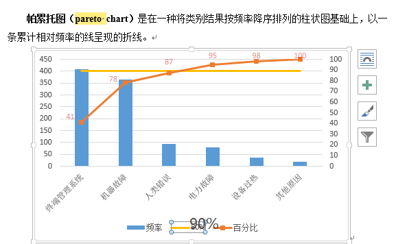 如下图,帕累托图(pareto chart)是在一种将类别结果按频率降序排列的柱状图基础上,以一条累计相对频率的线呈现的折线。