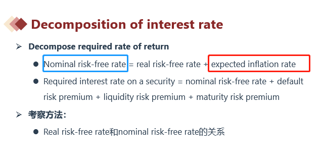 老师板书中的名义利率可以理解为名义无风险收益率(蓝色),可以拆分为真实无风险收益率和预期通胀率(红色)。