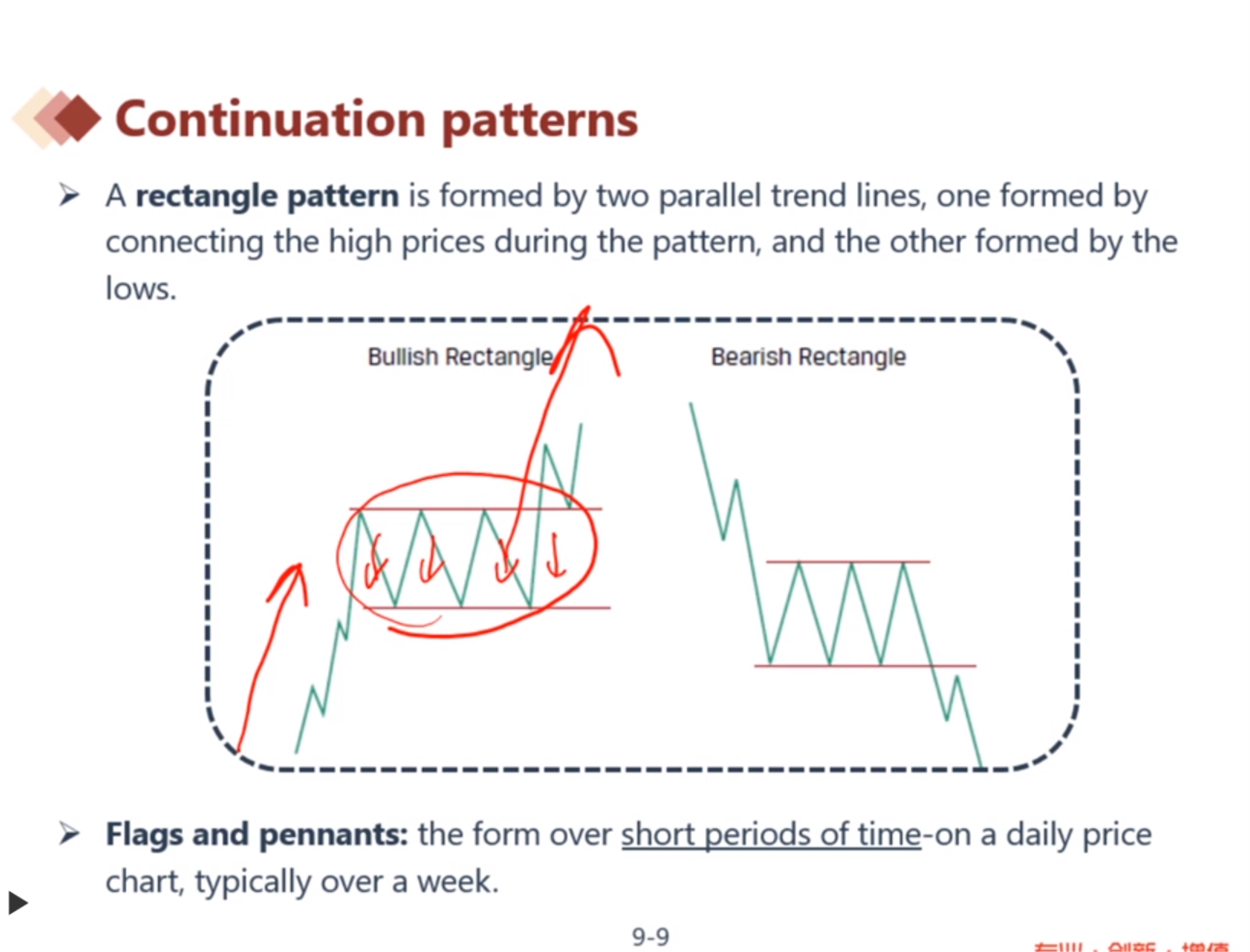 一个continue pattern持续上涨的趋势中,有多次短时间的上下波动,这些来回反转不是反转趋势,“趋势”需要较长的时间来形成趋势