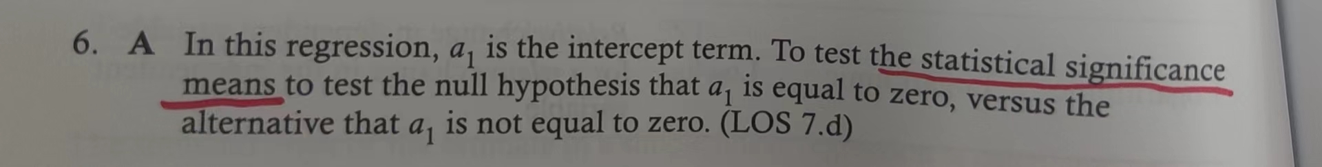 请看图片,打叉的错题No.4,选B答案说错了,要选A。 既然问的是线性关系的截点的假设, 不是当然应该问截点截在正还是负吗?如果H0假设是=0,那不就是没有代表截点吗? 线性关系怎么可能没有截点,这还用做假设来验证吗?